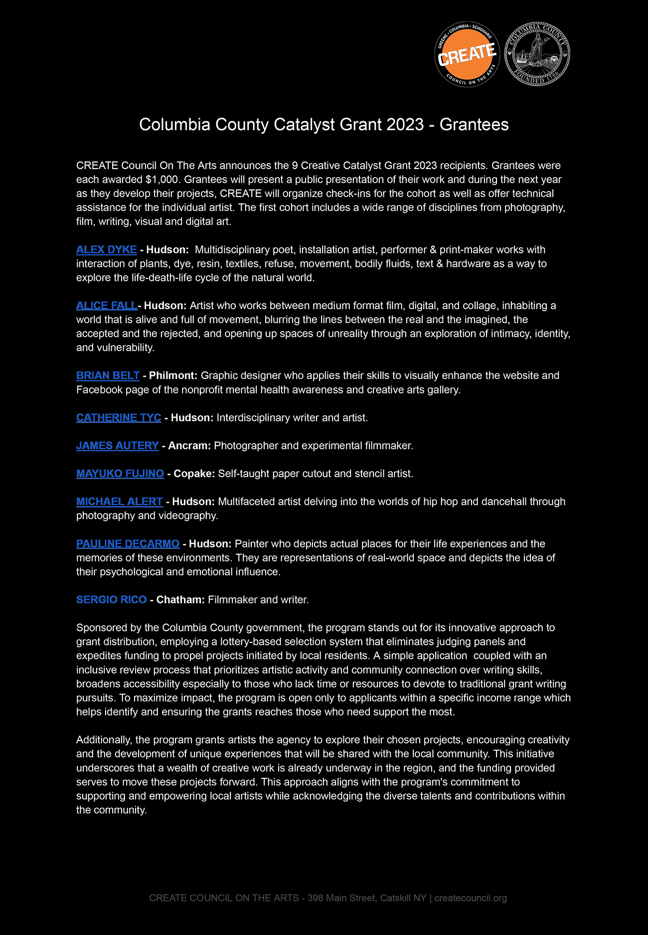 Posted on December 21, 2023 (February 13, 2026) by Admin Creative Catalyst Grant Recipient 2023 Columbia County Creative Catalyst Grant Recipient NEWS NEWS